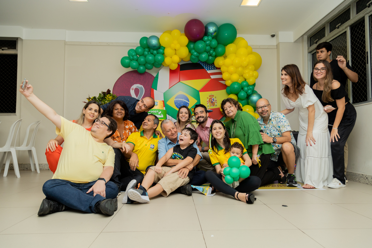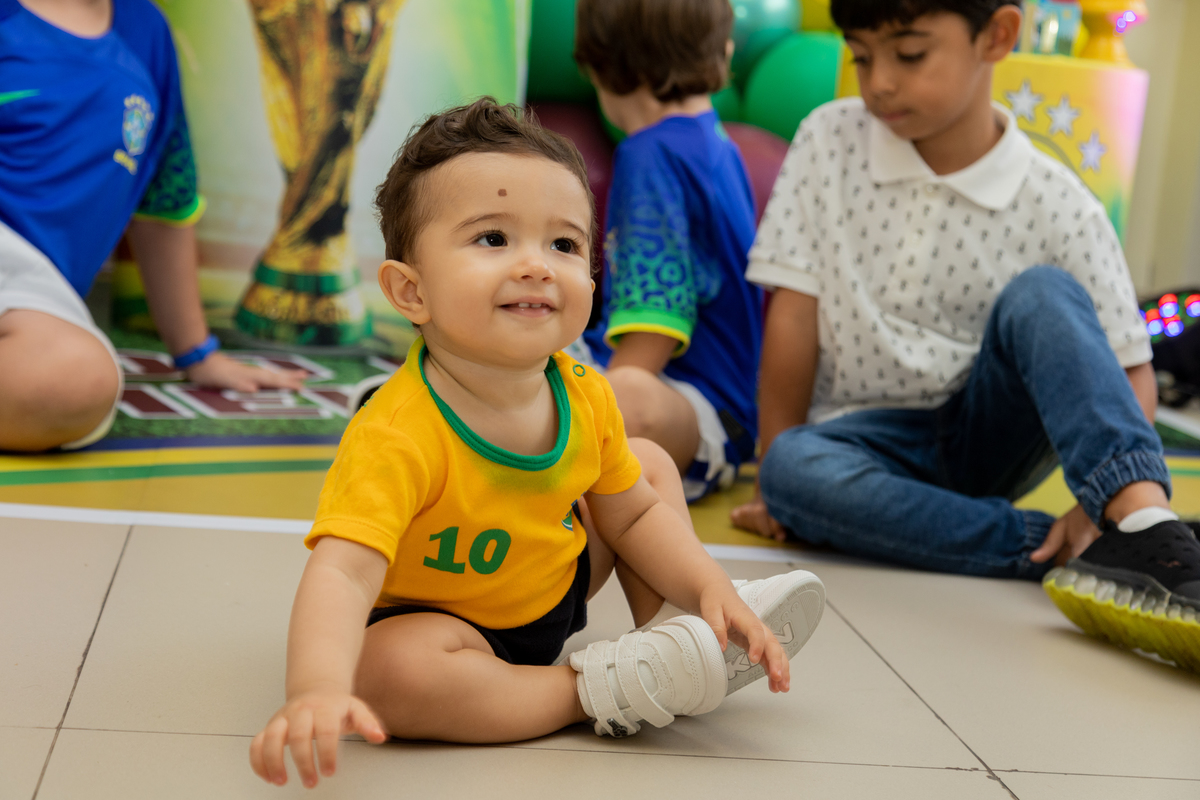 aniversariante sorridente sentado no chão com cenário copa do mundo