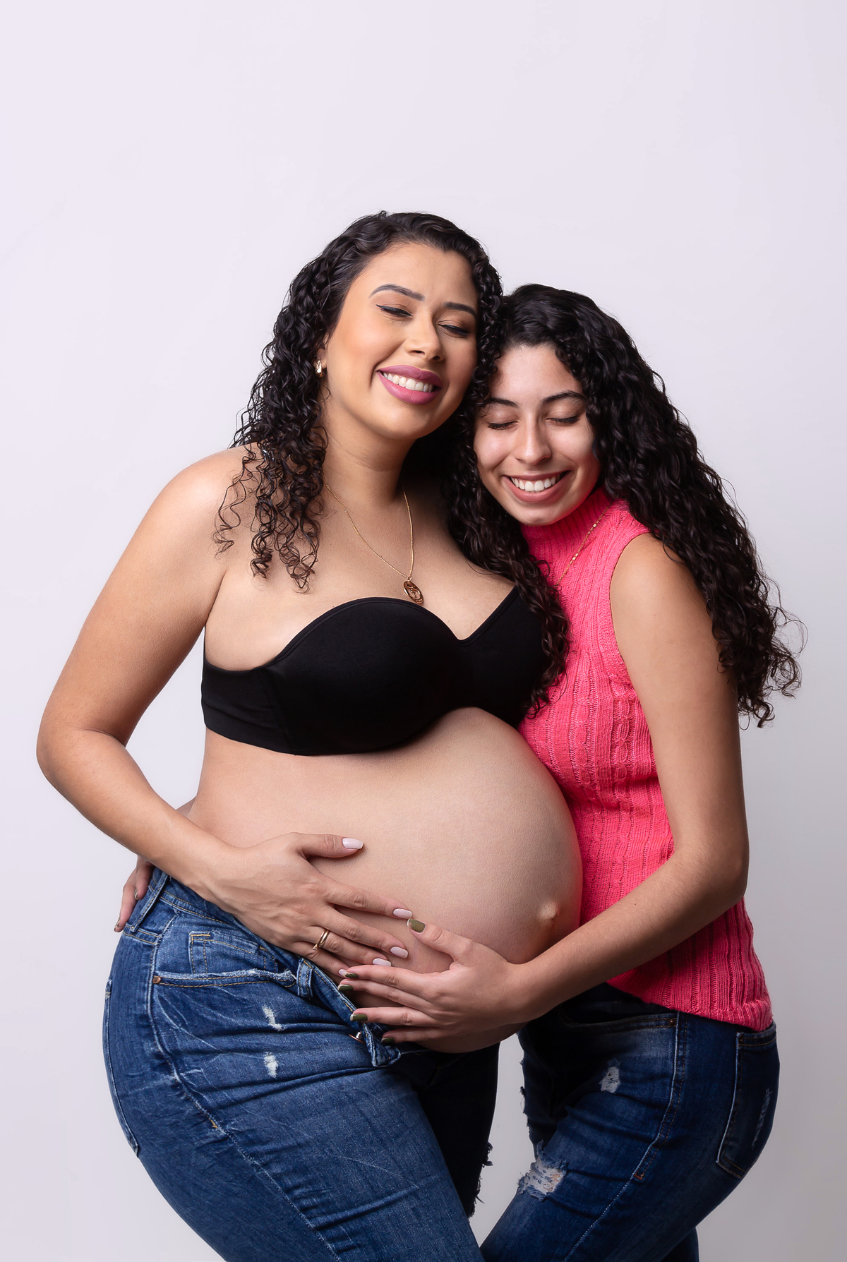 gestante segurando a calça e tocando na barriga